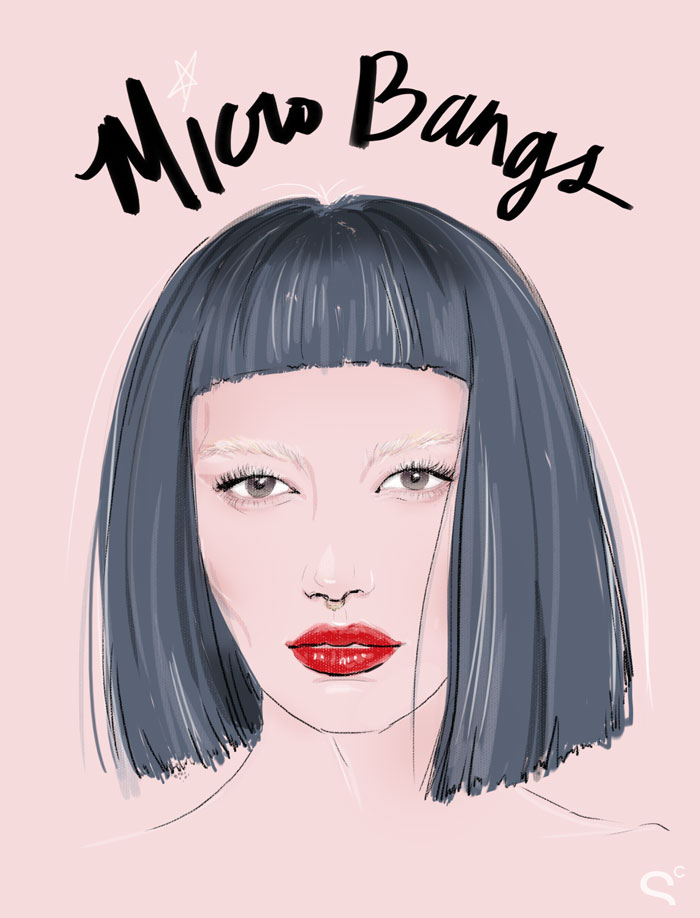 Also known as “baby bangs,” these shorties are the minimalist dream. Micro bangs can be cut blunt or choppy, but they’re generally always edgy and compact. They stay out of your eyes and don’t fuss up your forehead too much while still giving you a cool face-framing option, so if you want something relatively low-maintenance that’ll still make a statement, your search ends here. Cut anywhere from about an inch above your brows, and leave the fringe slightly wider than where your eyebrows end. It opens up your face in a bold way, like drawing curtains aside and letting your features shine through.