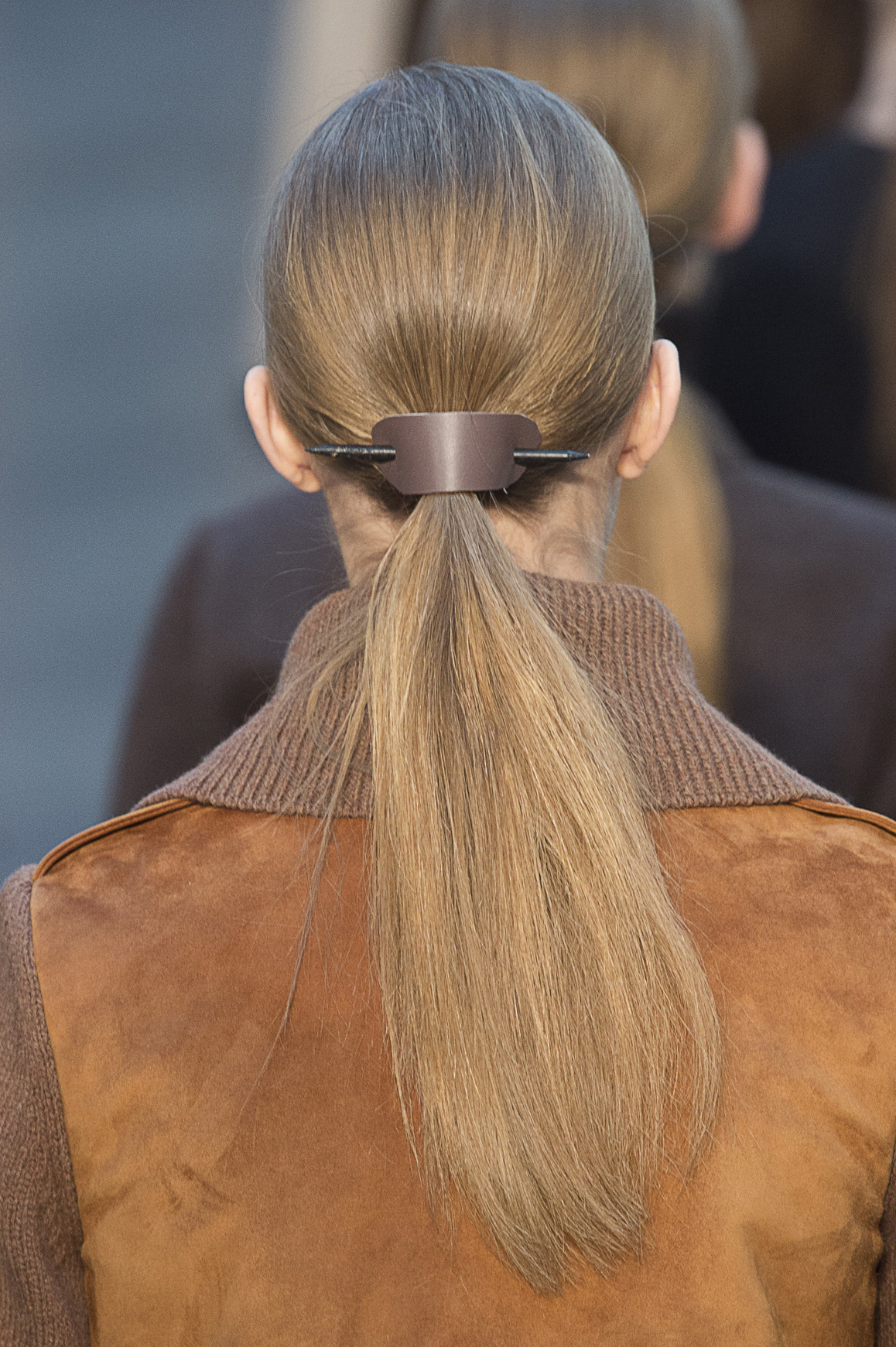 Toss that boring hair-tie aside—do you even like it anyway? After securing your style with a clear elastic band, jazz it up with a leather barrette like the models at Derek Lam’s show.
