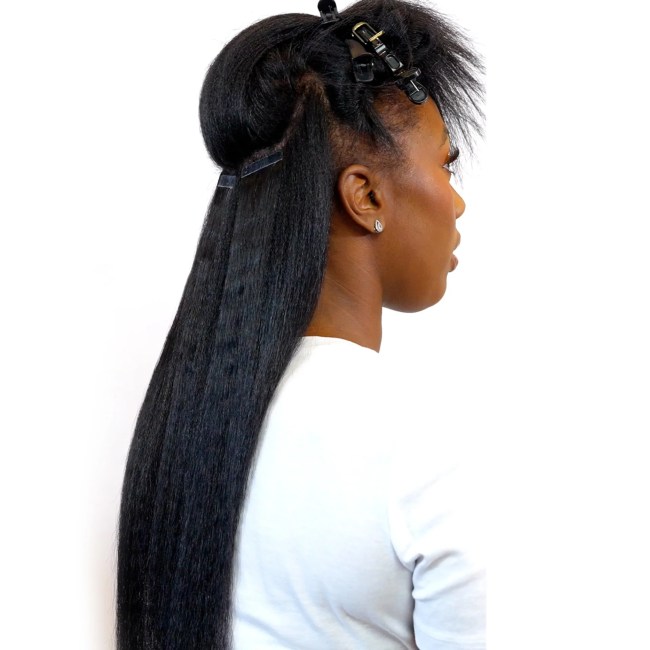 How it works is the small sections of natural hair are sandwiched in between two wefts. “The application is very secure, easy, and damage-free,” Dylan added. “[Tape-ins] can also work in place of coloring and bleach adding dramatic or subtle highlights/lowlights depending on the colors chosen by you and your stylist and what your end result goal is.” Generally, the reapplication is every 4 to 8 weeks.