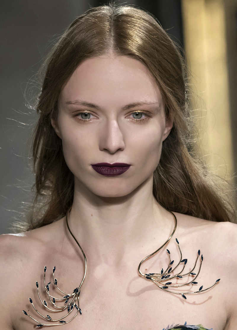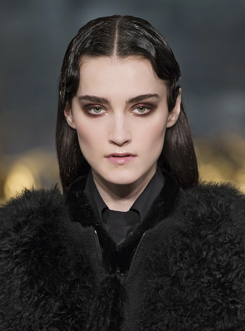 Elie Saab took the cat-eye in a bronze direction, softening the lines with a near-smoky metallic blend of dark and golden bronze makeup. It looks great with the models’ otherwise bare faces and loosely waved hair, but we’re betting this bronzed cat-eye would also look killer paired with a brick red lip for a dramatic nighttime look.