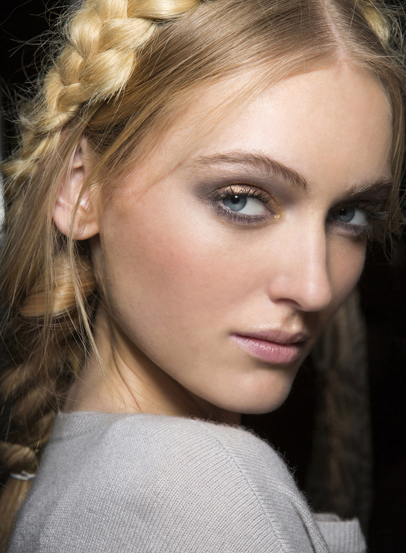 The soft bronzed metallic eye with deep plum lipstick at Luisa Beccaria is pretty much the epitome of fall makeup. The well-balanced look screams brooding romantic, so you’ll want to bust this one out on your next date night.