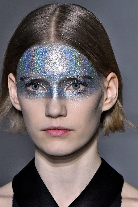 It looks as though McGrath painted models in silver glitter from the bridge of the nose all the way up to the hair line without a speck of skin peeking through. While this dazzling look isn’t work-appropriate or even fitting for a girls night out, it’s definitely inspiring us to channel our inner-galaxy woman for Halloween 2019.