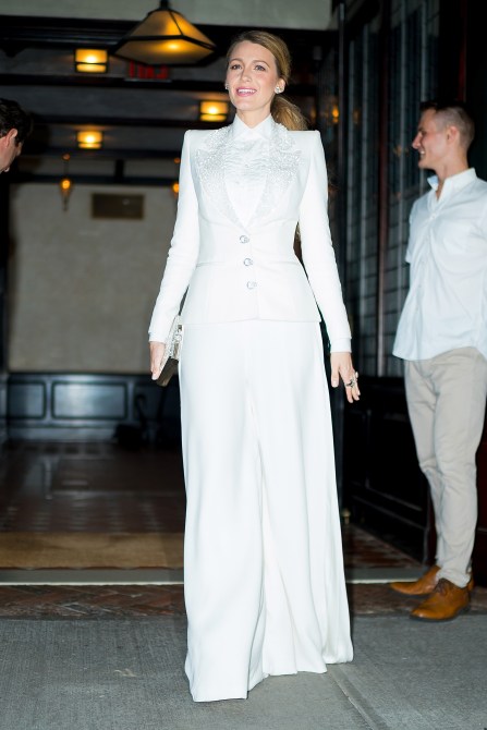 Up until this point, Lively’s style has been sexy, sophisticated and pretty low-key (as far as celebrities go, at least). She’s worn clingy gray sweaters, sparkly dresses and shiny red coats. But on August 17, something changed in her. She started wearing pantsuits—and only pantsuits. I’m not kidding. Every single photograph of her from the last month features some kind of suit.