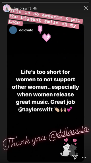 Taylor apparently, really appreciated the gesture because she reposted Demi’s story and added, “This is so awesome & put the biggest smile on my face. Thank you @ddlovato.”