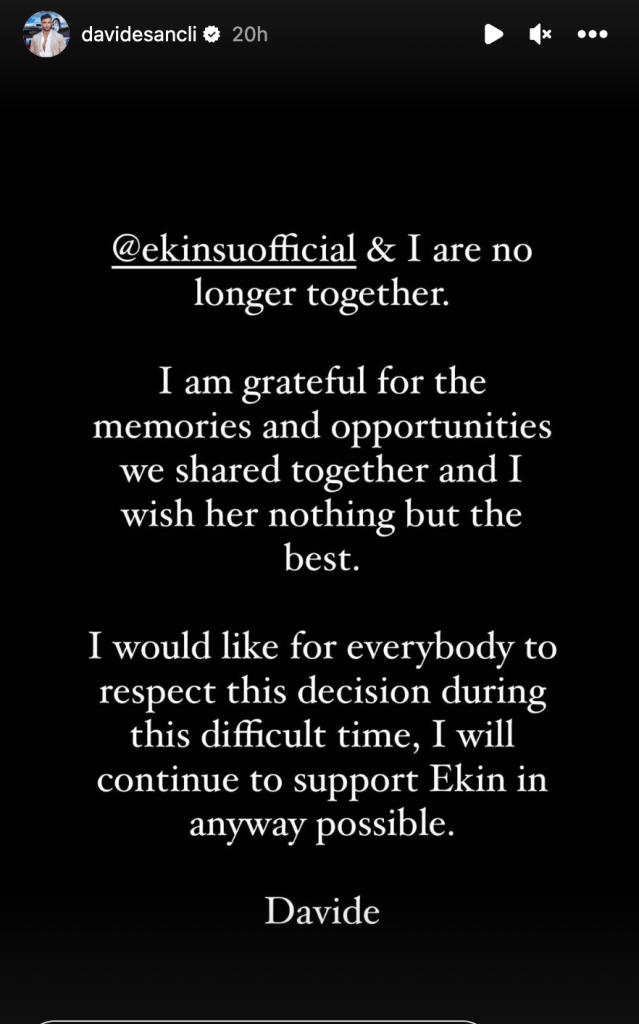 On June 29, 2023, Davide posted on his Instagram story, “@ekinsuofficial & I are no longer together. I am grateful for the memories and opportunities we shared together and I wish her nothing but the best.” He continued, “I would like for everybody to respect this decision during this difficult time, I will continue to support Ekin in anyway possible.”