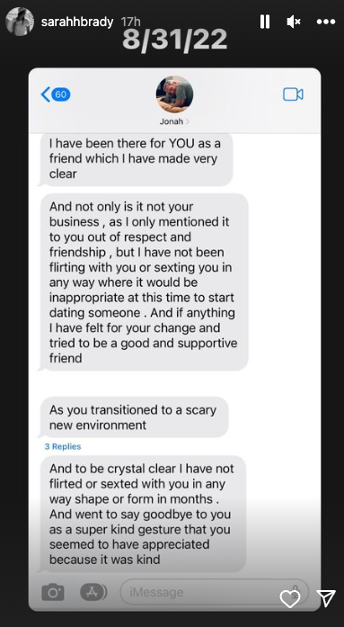 In an alleged exchange from less than a year ago, Hill can be seen asking if Brady is around for a catch-up. A text that is dated Aug. 30, 2022 then reads: “I know I don’t need to but in the spirit of pure respect to our friendship and appreciation for each other I did want to be transparent that I did start dating someone recently. I’m sorry if that is painful it just happened and I didn’t want to not be transparent with you ever as I care about you.”
