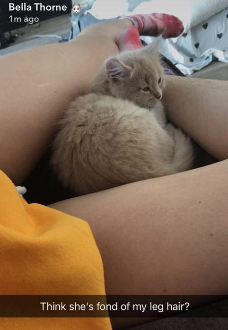 Leg hair, don’t care! Bella Thorne apparently thinks so (us too!), as evidenced by an adorable clip of her cat snuggling into her unshaven legs yesterday on Snapchat. Side note: Leg hair and a cat? The 19-year-old is basically living our Sundays.
