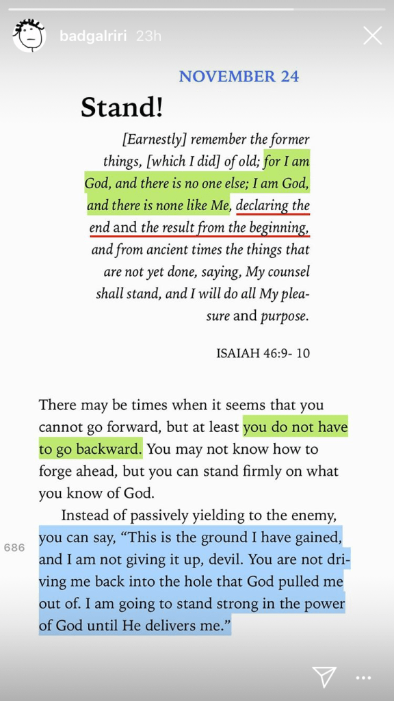 But what was Rihanna’s response? Soon after Brown’s comment, the singer took to her Instagram story with a cryptic message about “moving forward.” The Instagam story featured a Bible verse, with an inspiring message. “There may be times when it seems that you cannot go forward, but at least you do not have to go backward,” the message read. “You may not know how to forge ahead, but you can stand firmly on what you know of God.”