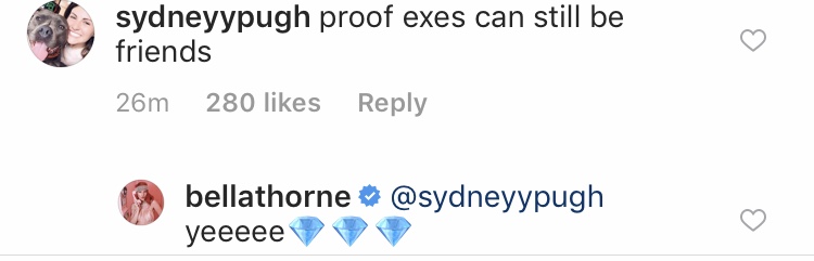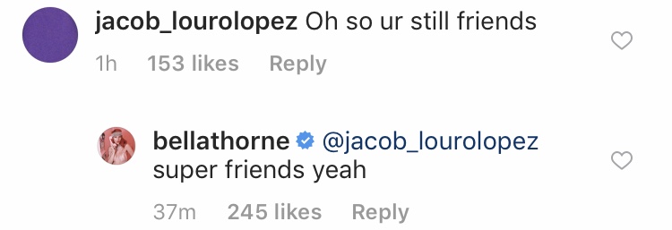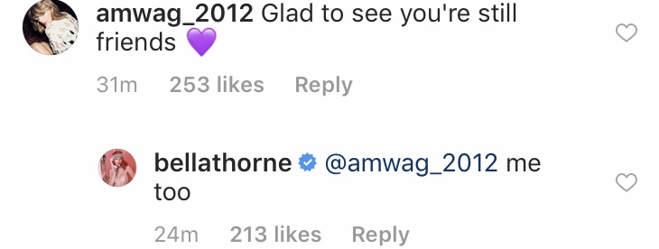 Understandably, fans were ecstatic to find out that Thorne and Sulkin were still friends. “Proof exes can still be friends,” one fan wrote, to which Thorne responded with “yeeeee.” “Glad to see you’re still friends,” another commented, to which Thorne responded, “me too.” Another fan wrote,”Oh so ur still friends.” Thorne responded, “super friends yeah.”