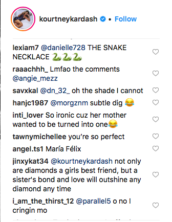 And fans are behind her 100 percent. “YAAASSSSS keep an eye out on the snakes 🐍,” one wrote. “Oh i feel the shade ok kourtney i f**k with you that diamond snake piece #queenofshade❤💋.”