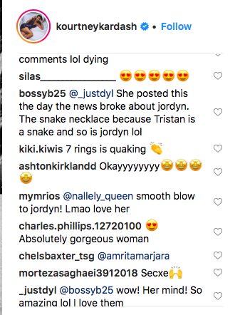 One follower who commented on the reality star’s photo seemed to think the snake was referencing both Woods and Thompson. “She posted this the day the news broke about jordyn. The snake necklace because Tristan is a snake and so is jordyn lol.” (They had their facts a little wrong. Kourtney posted this photo just one day ago. But still, they could be right that the snake is calling out both of the wrong-doers.)