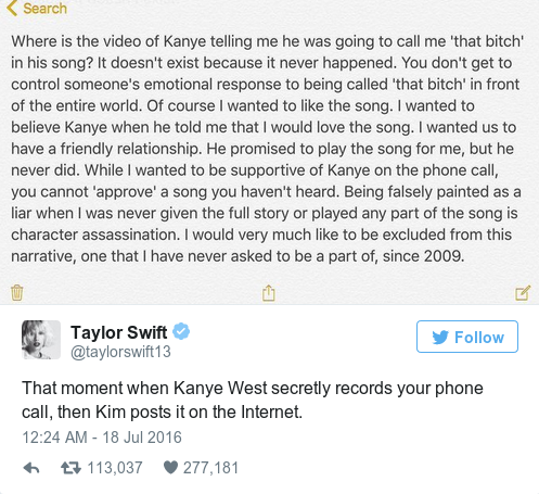 This prompted Kardashian fans to hate on Swift for allegedly lying about saying the lyrics were OK. But Swift fought back writing that it wasn’t the line she approved that she was upset about—it was the line she wasn’t told about that called her “a bitch” that was not OK. Swift penned this note on July 18, 2016: