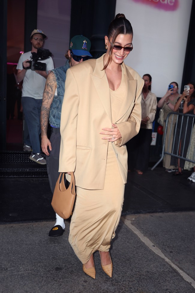 Hailey Bieber wearing sunglasses and a beige blazer.