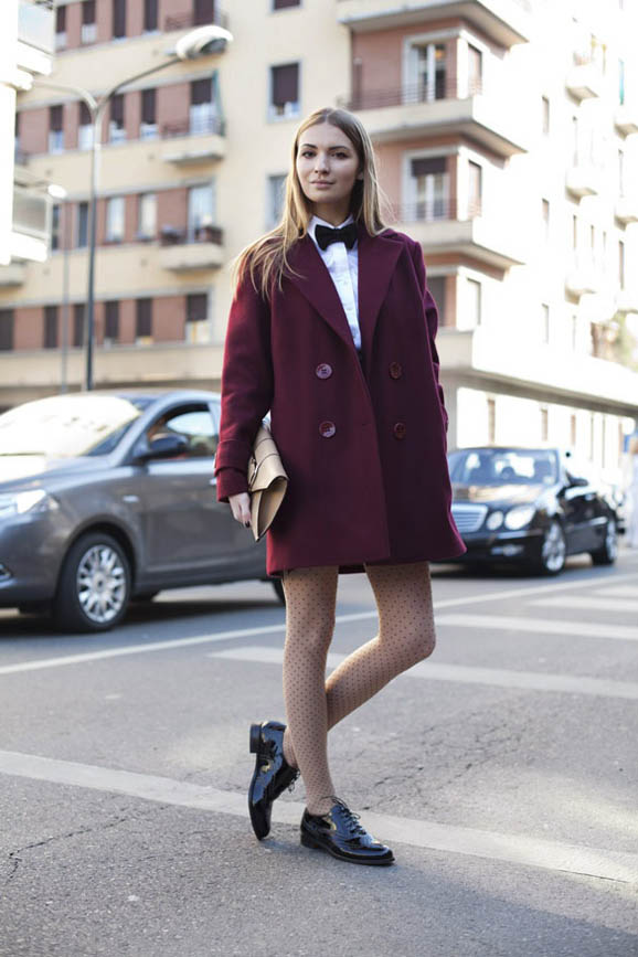 Who says a tuxedo requires pants? We love the look of an oversized menswear shirt with a bow-tie to boot and a double-breasted pea-coat (you could achieve a similar look with an oversized blazer). To keep your outfit from looking too risqué, why not pair it with brogues or pointy-toe flats?