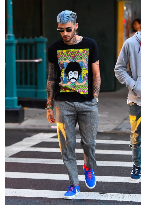 Breaking from the tired cliché of women rummaging through their partners’ drawers, Malik did the opposite, pulling out and putting on Hadid’s Wrangler x Peter Max tee. Only a few weeks after Hadid wore the psychedelic top, the singer styled it with plaid trousers and bright blue sneakers.