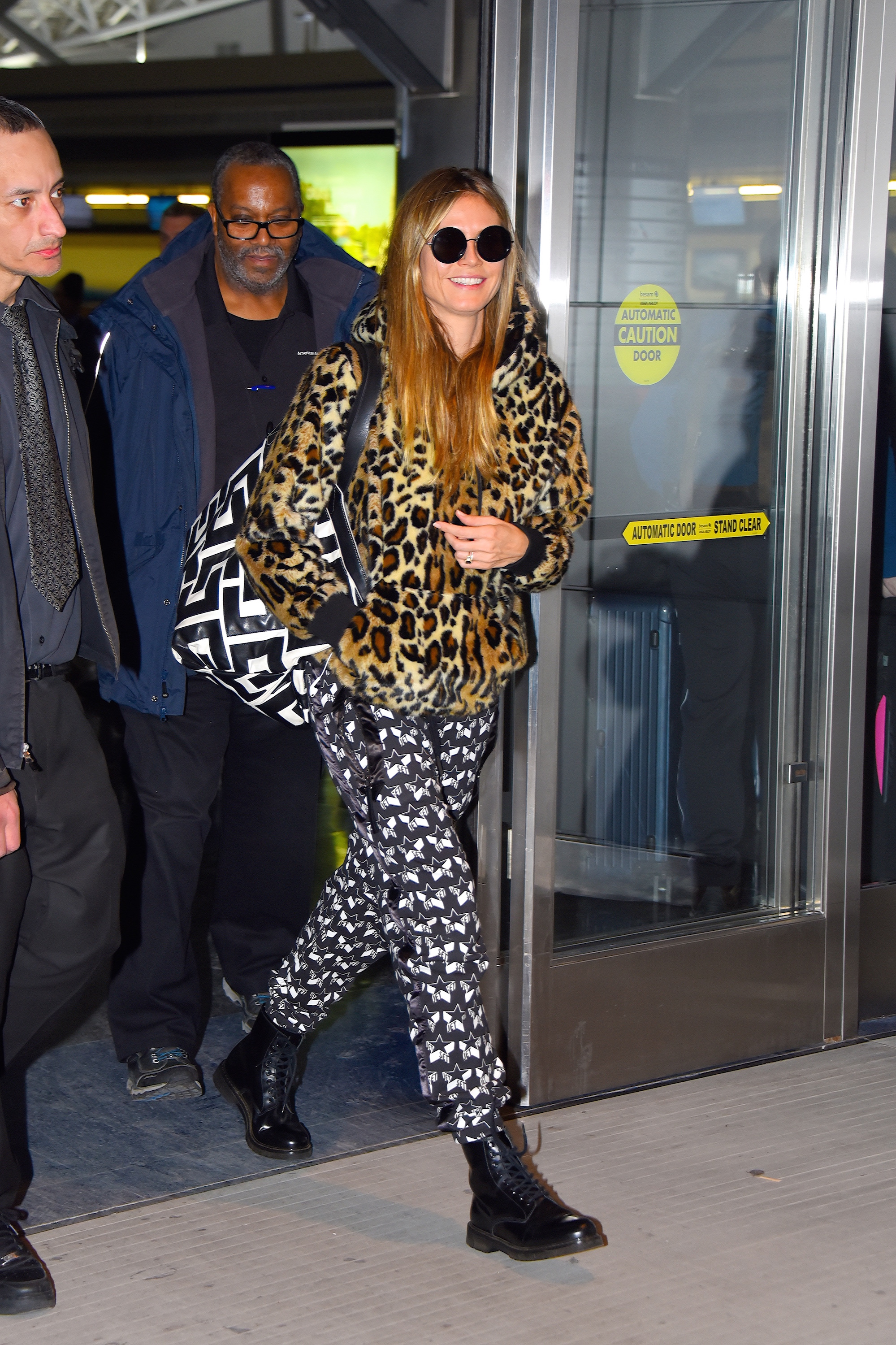Heidi Klum arrived in NYC on Tuesday wearing an ensemble that involved some next-level pattern mixing. The leopard print coat and star-patterned pants Klum wore made the outfit wildly maximalist, but the entire ensemble also looked extremely cozy. So, she definitely made a statement with her airport look (one-woman fashion show), but the outfit also kind of had some pajama vibes (down-to-earth sweats). Leave it to Heidi Klum to become an airport fashion enigma.