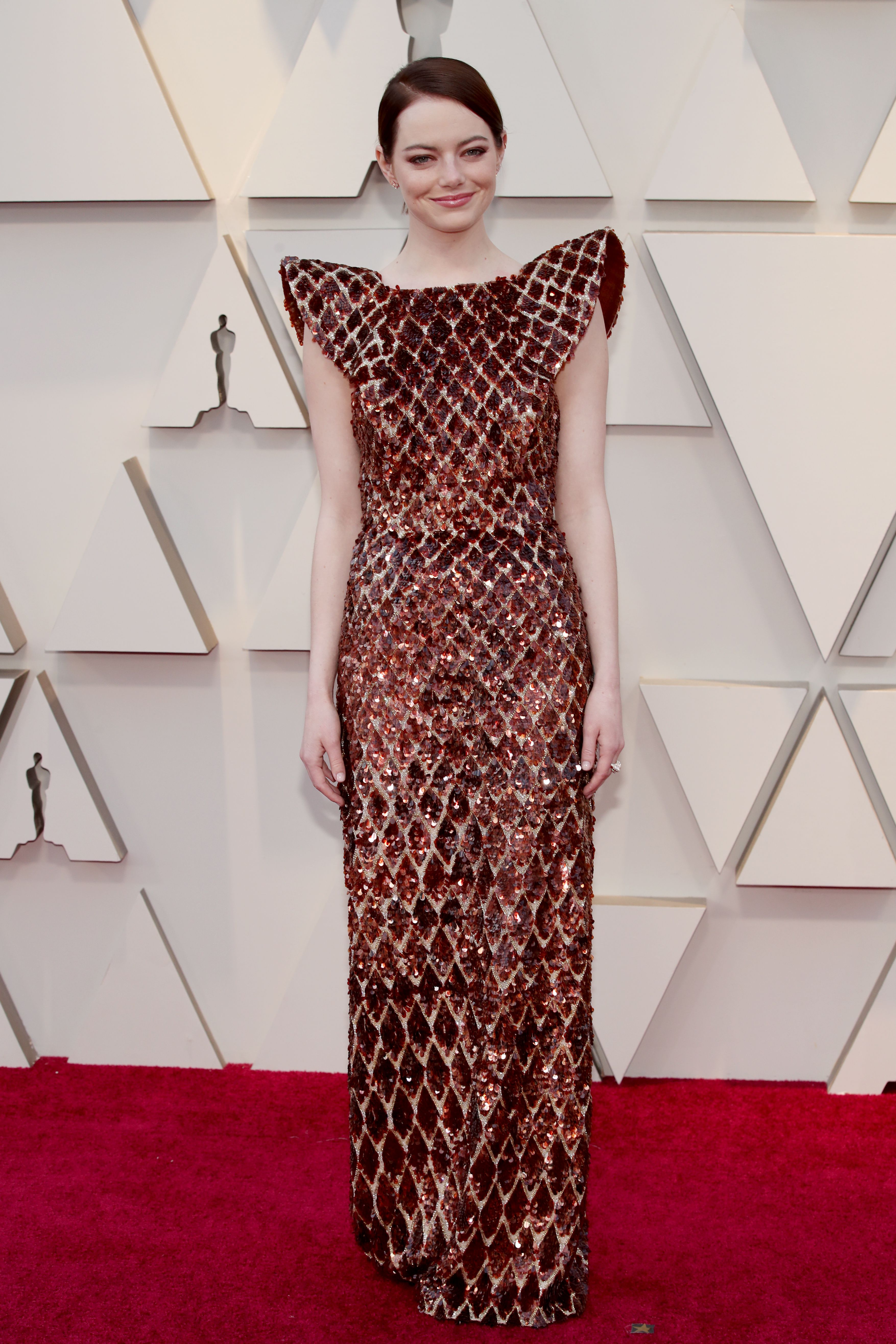 Emma Stone has become the poster child for the phrase “can’t stop; won’t stop.” Seriously, the actress can’t stop landing incredible roles or managing to pick the perfect ensembles to complement her red hair. And Emma Stone’s 2019 Oscars look only puts her higher on the pedestal. After wearing a beautiful gold gown in 2017 and a sleek red and pink suit in 2018 we weren’t sure in which direction Stone would go. But The Favourite actress arrived to the 2019 Academy Awards wearing a sequin dress so chic, I think the entire ensemble deserves an Oscar.