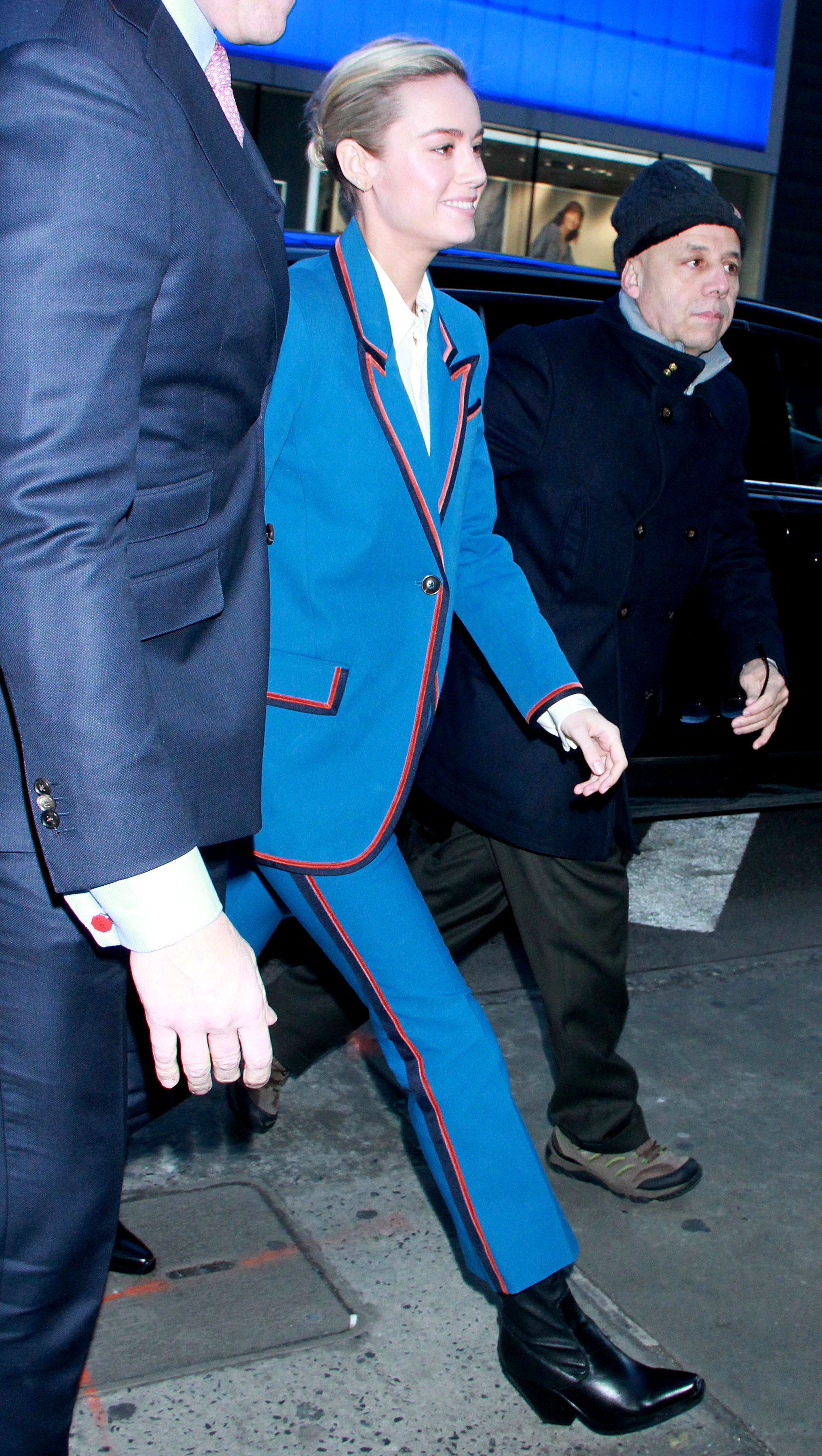 Hair pulled back in a tight bun, crisp white button down underneath the suit and classic black boots—I’d probably hand my suitcases to Brie Larson. Regardless of the chic bellhop vibes, I’m satisfied that the actress really can pull off anything. She even wore a completely sequined cut-out jumpsuit to a screening of Captain Marvel on Wednesday night, and looked amazing.