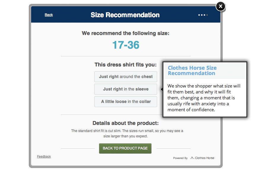 Basically, it’s a tool that will be on over 600 e-commerce sites that allows shoppers to click on a “What size am I?” button. From there,  you’ll be brought to a quick (and we really mean quick! It takes about 20 seconds!) pop-out Clothes Horse survey with basic  questions about your size. The pop-out will then do it’s job to calculate the perfect size for you in a specific brand, instead of you having to consult a generic size chart.