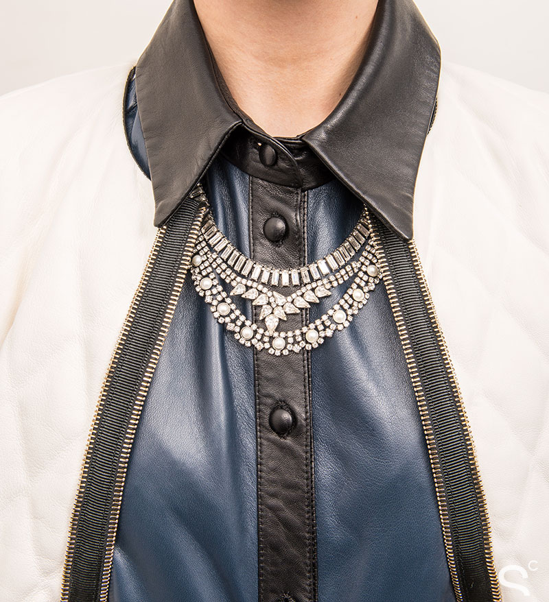 5. A sparkling statement necklace will look elegant and cool next to zippers with brassy hardware and a buttoned to the collar top (especially if that top is made of leather, like this one).