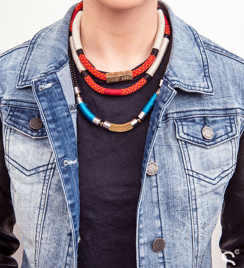 4. Add some color to your denim jacket meets t-shirt uniform with necklaces made from colorful rope or other brightly hued materials.