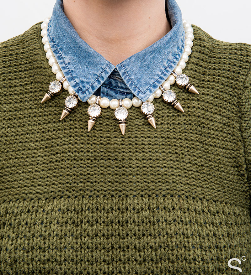 7. These aren’t your grandmother’s pearls. Try a necklace that mixes elements like pearls, rhinestones, and studs for a look that is as versatile as it is fun.