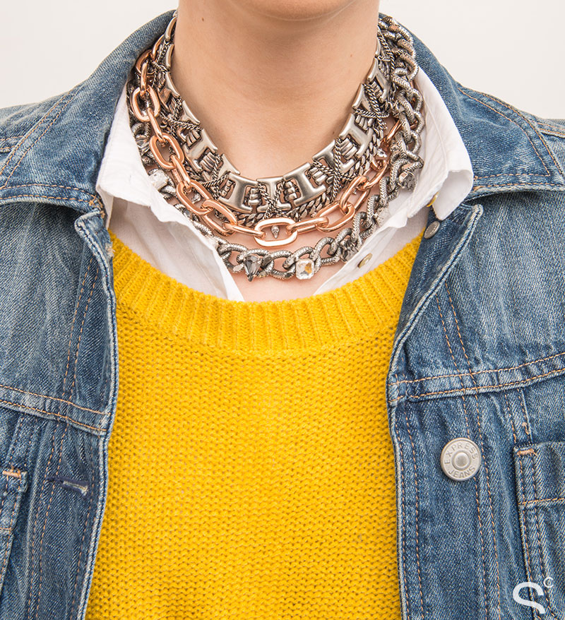 3. Stack thick chains in mixed metals to give your preppy sweater and collared shirt combo and edge.
