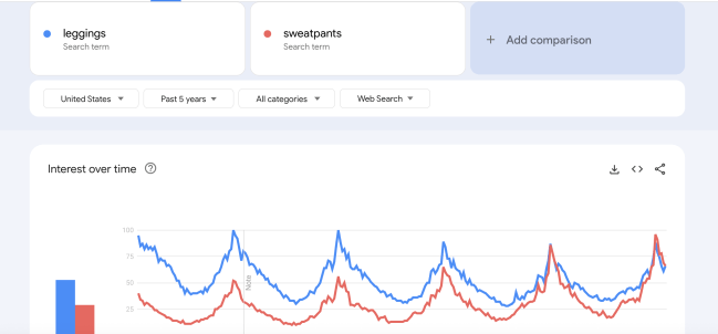 You can also see how search for “sweatpants” has actually eclipsed “leggings” on Google Trends, too: