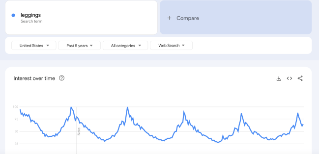 As you can see from this screenshot from Google Trends, the annual winter peaks are shrinking year after year, which more or less proves the point that leggings are, in fact, going out of vogue. And clothing companies know it, too. According to Business of Fashion, “Retailers too have pulled back from the style. As of the first quarter of 2025, leggings accounted for 39% of bottoms assortments across activewear brands, according to retail intelligence firm Edited—that’s down from 47% in 2022.”