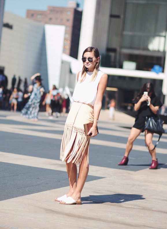 Get inspired by Danielle Bernstein of We Wore What, and pick up a fringed skirt, or a dress with a fringe bottom, and make it the statement piece of your outfit. Finish off your look with minimalist accessories in neutral colors like white, black, or grey, letting the fringe do the talking. Once the weather cools down, pair a fringed skirt with a slim black turtleneck, or a cropped leather moto jacket.