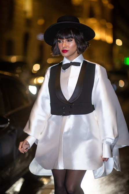 American actress Kat Graham is seen wearing a black hat, sheer tights and white dress with a tuxedo vest outside Jean Paul Gaultier.