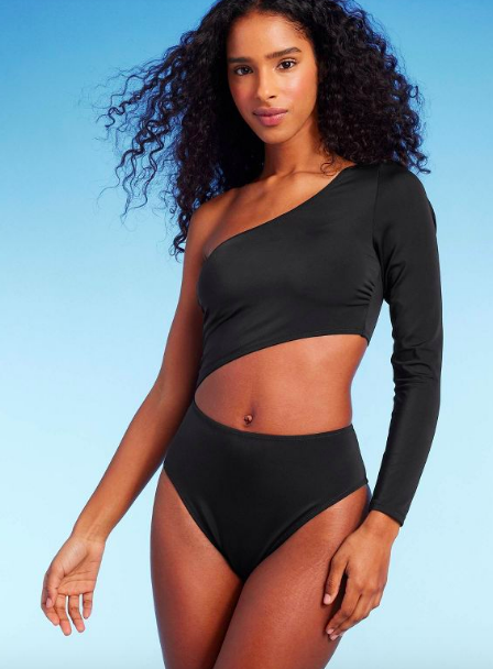 Long-sleeve styles can still show some skin! This one has a stomach cut out, and one arm free so you can make a chic fashion statement as you splash around beach-side.