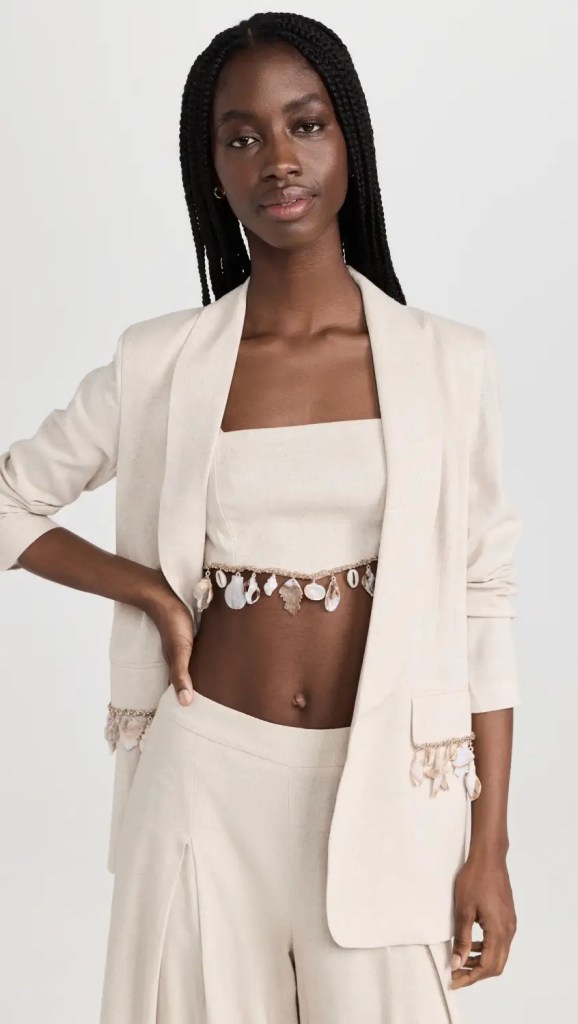 Everyone loves a loose-fitting, oversize blazer (hello, Hailey Bieber), and PatBo designed a beautiful summer-weight version adorned with beaded seashells. Considering it’s so hot (everywhere), I love the way it’s styled here with a shell-decorated bandeau top.