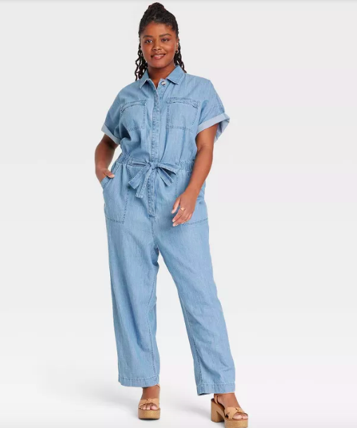 Head to toe denim and chambray looks are in this summer, and this jumpsuit is the perfect addition to your closet. It’s available in sizes 0 through 26.