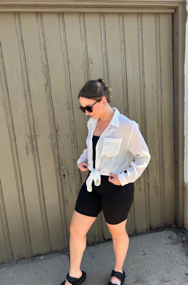 If you can’t tell by now, everything I’m pairing with the Amazon romper is endlessly versatile on its own. And because I already know you have a linen button down in your closet (here’s one if you don’t), that’s exactly what you’ll need to replicate this breezy fit. Slick your hair into a claw clip. Theen, keep the top unbuttoned and oversized over the romper or tie it at the waist (my preferred option).