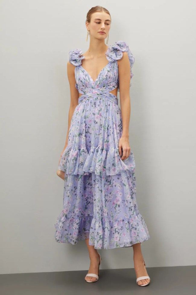 Embrace all the ruffles, tiers, and floral prints with this cutout creation by Ieena for Mac Duggal. Keep it casual by opting for neutral footwear and minimal jewelry, or lean into the aesthetic by wearing a big bow in your hair.