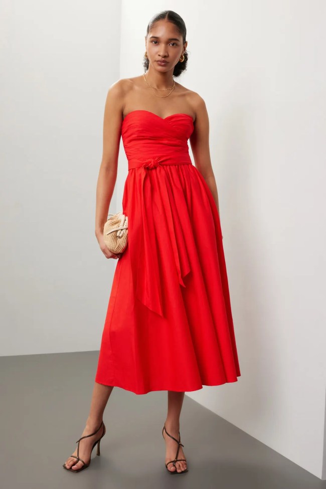 Some people shy away from wearing red at weddings, especially since the colorway is so bold. But it’s 2024, and for most couples saying “I do,” the main rule is that there are no rules (except maybe not wearing white). Keep things understated by choosing this classic, strapless design, which will pair perfectly with an oversized black blazer should you get cold.