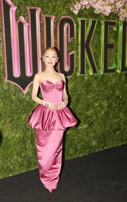 Ariana Grande arrives at the Los Angeles Premiere Of Universal Pictures “Wicked” in a custom Thom Browne pink and white gingham dress.