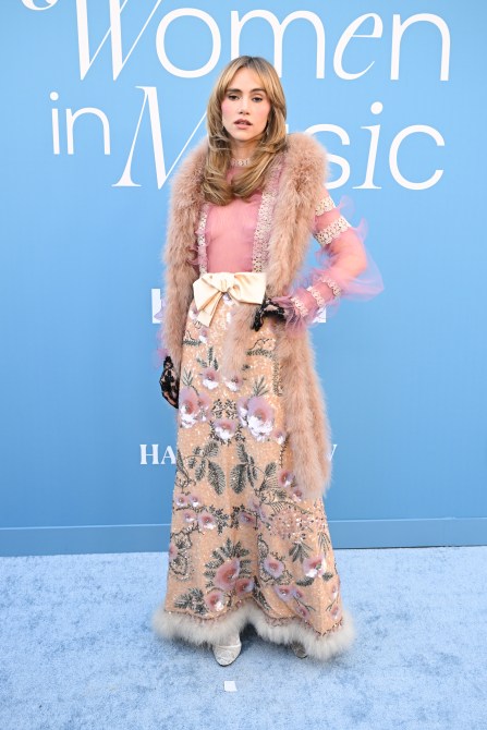Suki Waterhouse also turned heads in a statement-making Valentino look. And trust us—don’t try this at home. Her dress featured a pink sheer bodice with lace-like suspenders covering her chest, flowing into a butter-yellow sequin skirt adored with floral appliqués and a bow at the waist. The hem? Trimmed with fur. A total fashion moment.