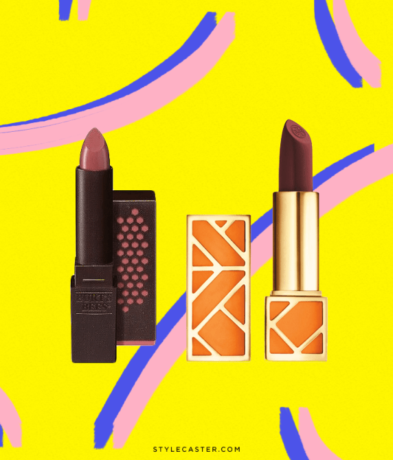Burt’s Bees Lipstick in Blush Basin, $9; at Burtsbees.com; Tory Burch Lip Color in Knock on Wood, $45.49; at Amazon