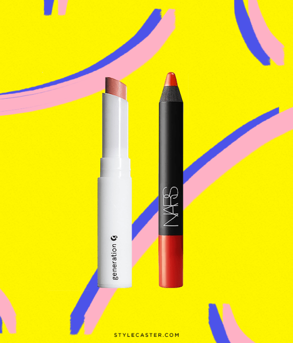 Glossier Generation G in Cake, $18; at Glossier; Nars Lip Pencil in Red Square, $26; at Nars Cosmetics
