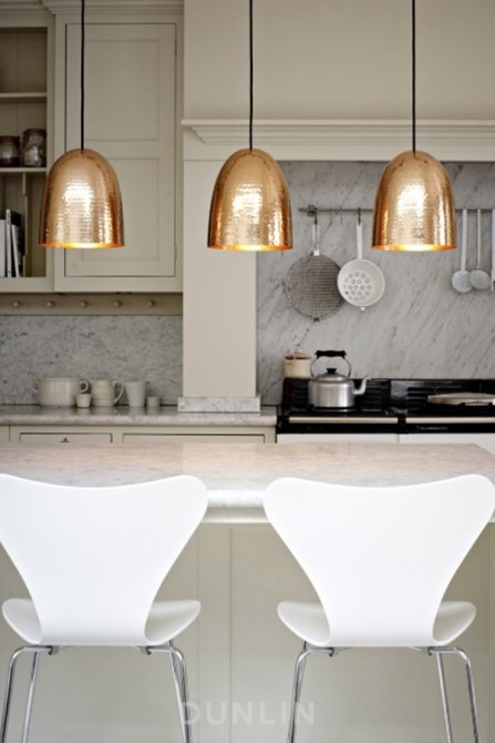 These hammered-brass dome pendants are a little pricey, but they’re so chic! Since I’m not a huge fan of color, we opt for lots of texture and metallics.”—Candace Napier, designer & Pinterest account manager