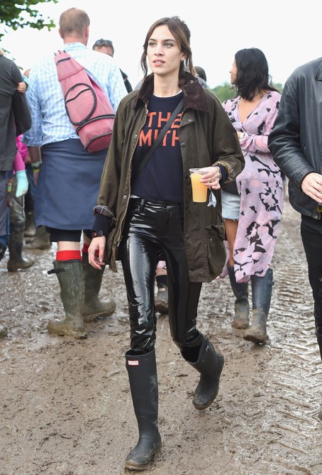 Alexa Chung in a Hades sweater, Barbour coat, and Hunter boots