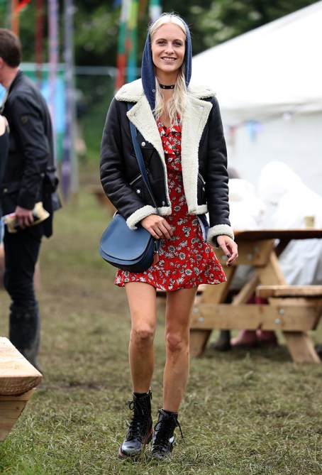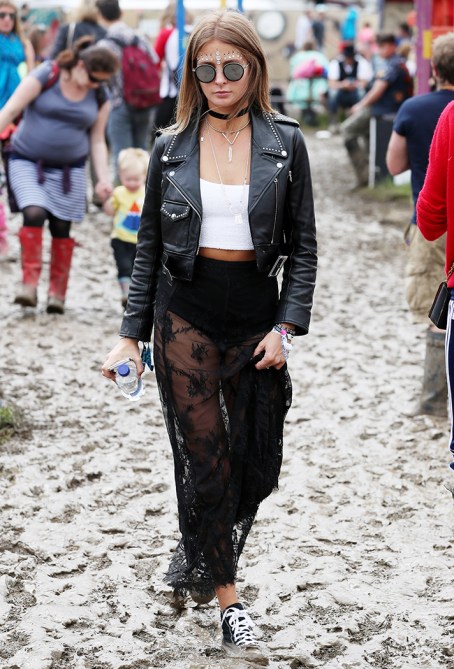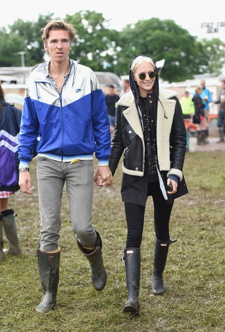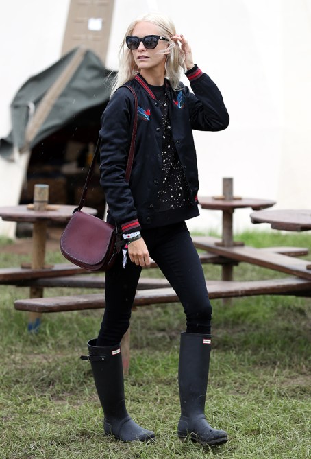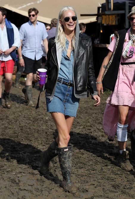 Poppy Delevingne in a Mother skirt and Hunter boots