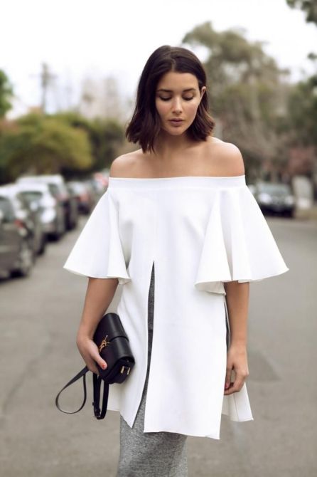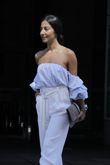 NEW YORK, NY – SEPTEMBER 13: Guest is seen on the streets of Manhattan outside of the Rachel Zoe Spring 2016 fashion show at Skylight at Clarkson Sq wearing Johanna Ortiz white high waisted pants and off the shoulder blue and white top on September 13, 2015 in New York City. (Photo by Georgie Wileman/Getty Images)
