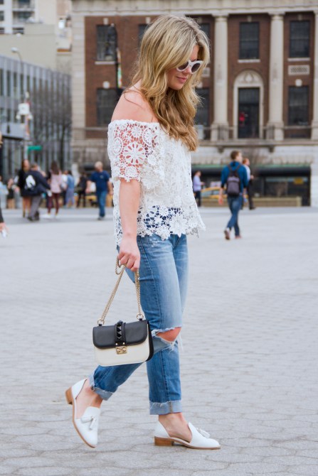 NEW YORK, NY – MARCH 16: Gillian Del Zotto wearing ripped J Brand Jeans, white lace Nightcap Clothing top, white leather Jeffrey Campbell shoes with tassels, black and white Valentino bag with studded detail and gold chain and oversized white Thierry Lasry sunglasses on March 16, 2016 in New York City. (Photo by Georgie Hunter/Getty Images)