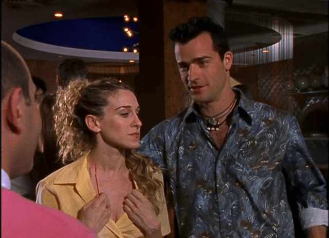 Fans of SATC already know Theroux played two different characters in two different episodes—in two different seasons. His Season 1 showing as writer Jared—one of New York magazine’s “30 Coolest People Under 30″—was smarmy and totally laughable, especially when he tries to hit on Carrie at Luna Park by asking if he can take her home. Spoiler alert: He couldn’t, because she makes Mr. Big meet her outside the bar at 3 a.m.