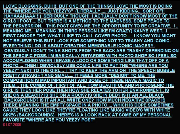 “I love blogging, duh! But one of the things I love the most is doing the ‘Where are you Yeezy’s’ (literally just kidding sort of!! Hahaha). Seriously though! I actually don’t know most of the girls I post…. But there is a method to my madness, some peace to the perversion. This post gives me the opportunity to be creative. I meaning me… meaning in third person like I’m crazy Kanye West. I first choose the, what I call the cover photo… I know you might not believe this but I look for something not too trashy and iconic. Everything I do is about creating memorable, iconic imagery. Obviously I don’t think shots from the back are trashy depending on the specific pose. I’m basically retarded with Photoshop so I feel so accomplished when I erase a logo or something like that off of a photo… Then I obviously use comic life to put the ‘Where are You Yeezy’ next to the girl.”