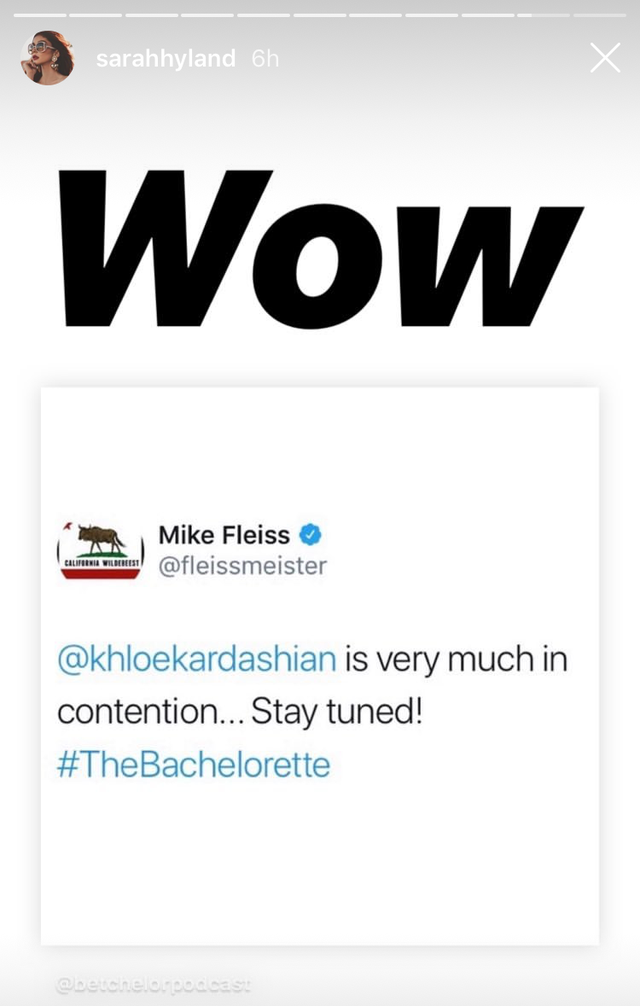 So, it seems Kardashian’s name is still in the ring for the next Bachelorette. And other celebs are all about it. Sarah Hyland was freaking out on her Instagram story. “This,” she wrote after seeing The Betchelor’s Tweet.