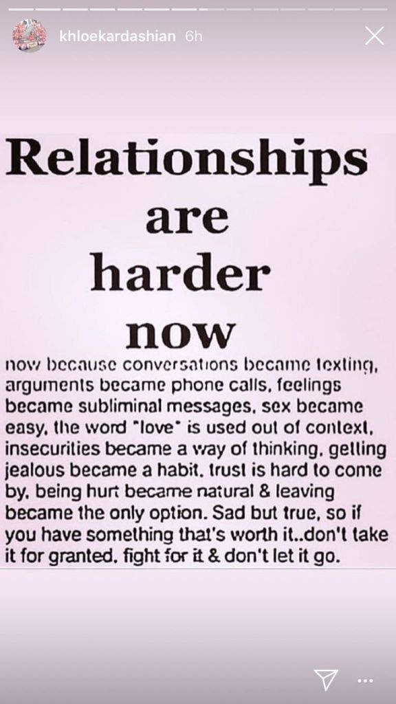 On January 19, 2018, Kardashian shared some deep quotes about relationships and how they are “harder now,” leading fans to believe that she and Thompson were no longer together. “Insecurities become a way of thinking, getting jealous becomes a habit, trust is hard to come by, being hurt became natural and leaving became the only option,” the quote read.
